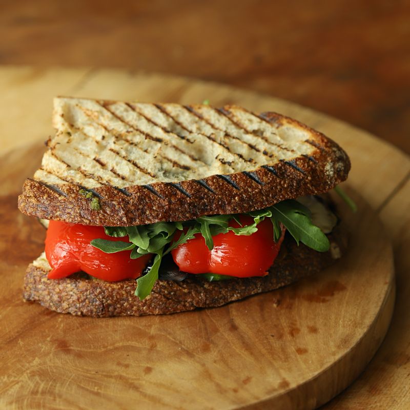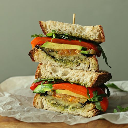 샌드위치 단골 재료인 햄과 치즈를 넣지 않고 비건으로 만든 샌드위치 레시피! 가지, 파프리카, 애호박 등을 오븐에 담백하게 구워내 구운 채소의 촉촉하고 부드러운 식감을 느낄 수 있어요. 산뜻한 올리브오일과 향긋한 바질 페스토로 풍미를 더해 즐기다 보면 다른 샌드위치는 생각도 안날 만큼 푹 빠지게 될 거예요!