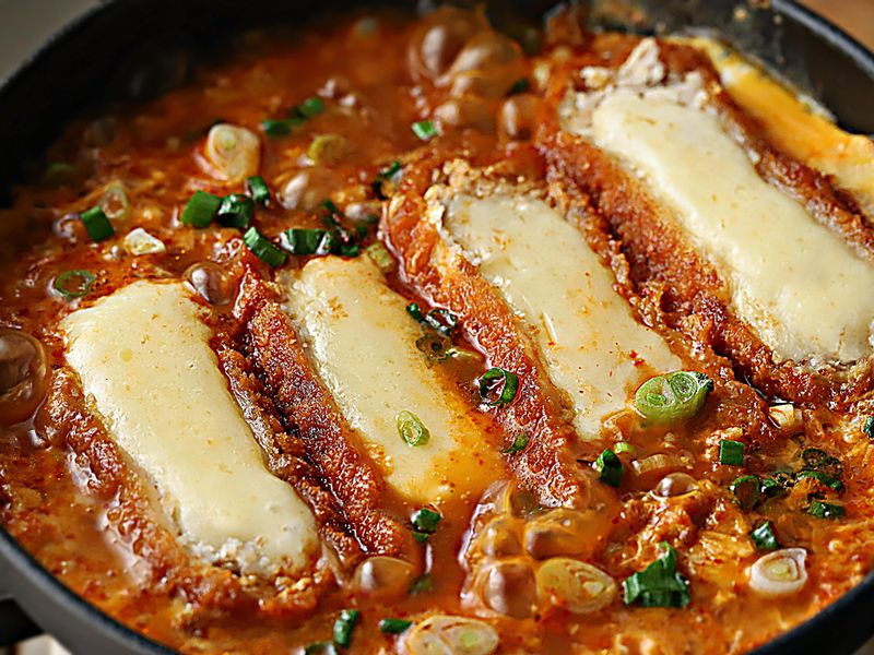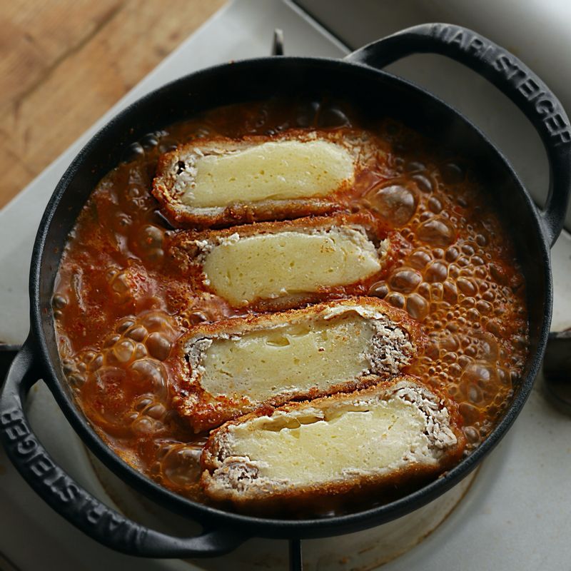 나베는 일본의 냄비 요리로 달큰한 맛이 특징인데요. 나베 속 잘 튀겨진 치즈 돈가스와 김치를 넣어 부드럽고 칼칼하게 만들었답니다. 국물에 적셔진 튀김의 맛이 정말 끝내줘요!