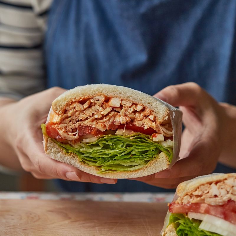 반으로 잘라낸 샌드위치의 단면이 정말 먹음직스러워 보는 맛도 훌륭한 레시피랍니다! 📝TIP 1. 마요네즈, 스리라차, 칠리 소스 모두 시판 저칼로리 소스로 사용하는 것을 추천드려요. 📝TIP 2. 식빵 대신 담백하고 고소한 통밀빵으로 만들어도 충분히 맛있어요.