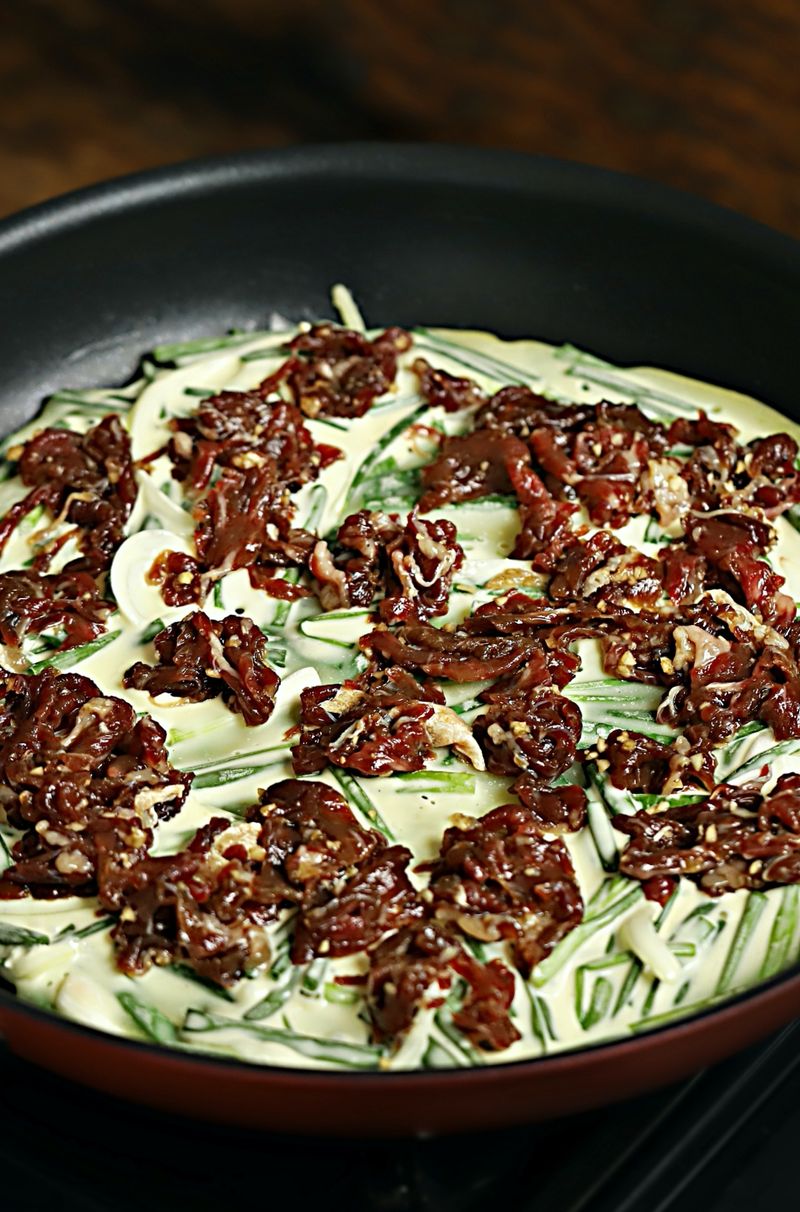 재료들을 아낌없이 넣어 부쳐낸 불고기 파전! 달짝지근한 맛을 더해주는 불고기가 파전에 정말 잘 어울려요. 추석에 다양한 전을 많이 먹었지만, 색다른 별미라 끊임없이 들어갈 거예요!