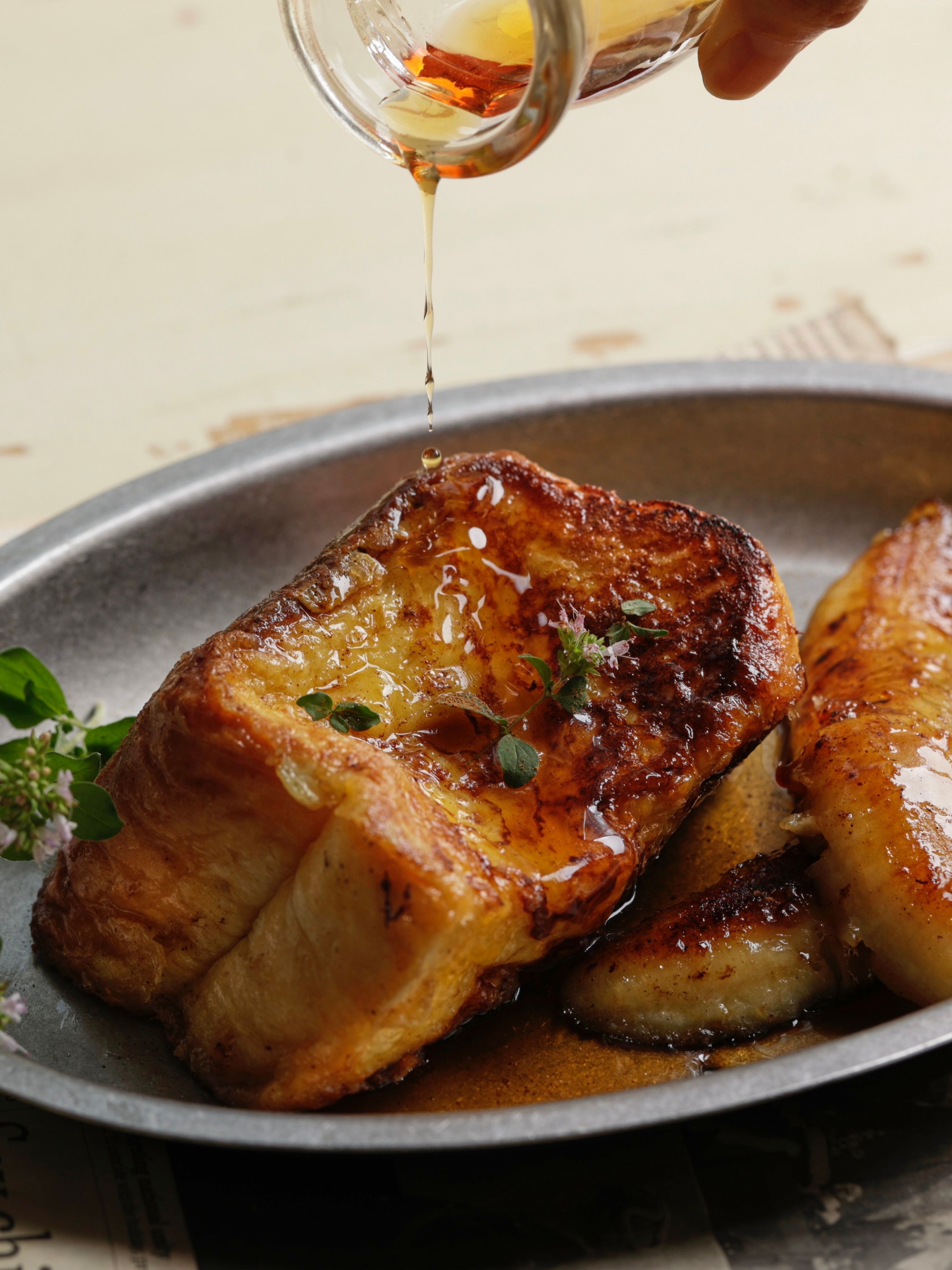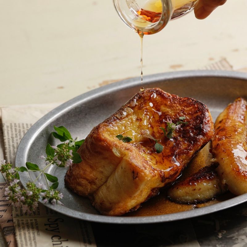 그냥 먹어도 맛있는 프렌치 토스트에 바나나와 메이플 시럽을 더해 한층 더 근사한 브런치가 되었어요. 익숙한 비주얼은 아니지만, 달달한 시럽을 듬뿍 뿌려 촉촉한 빵을 한 입 넣으면 더할 나위 없이 행복해질 거예요!