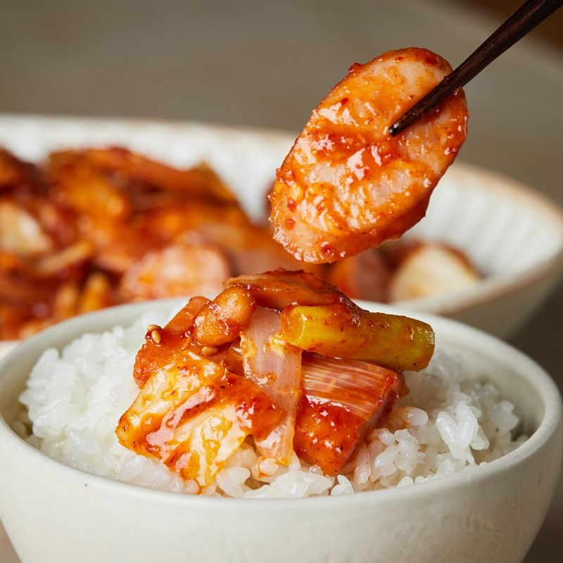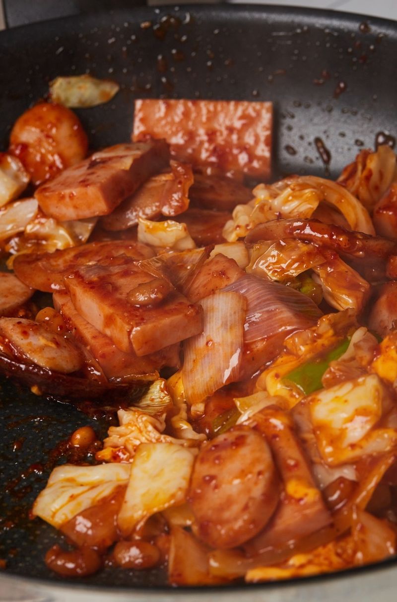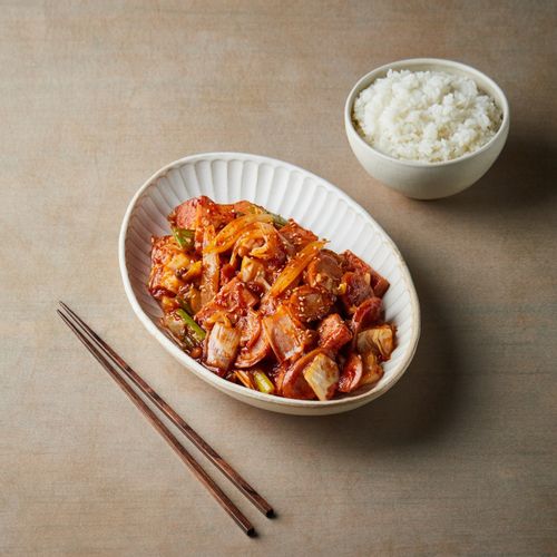 센스 만점 국물 없이 즐기는 부대찌개! 소시지와 햄, 각종 야채를 깔끔하게 볶아내 언제 먹어도 맛있어요. 밥 반찬으로도 좋지만 매콤 칼칼한 맛이 술안주로도 딱 좋답니다!