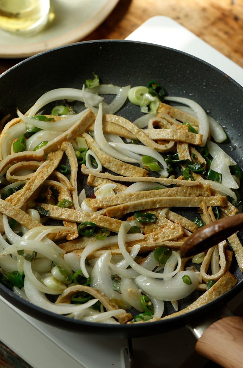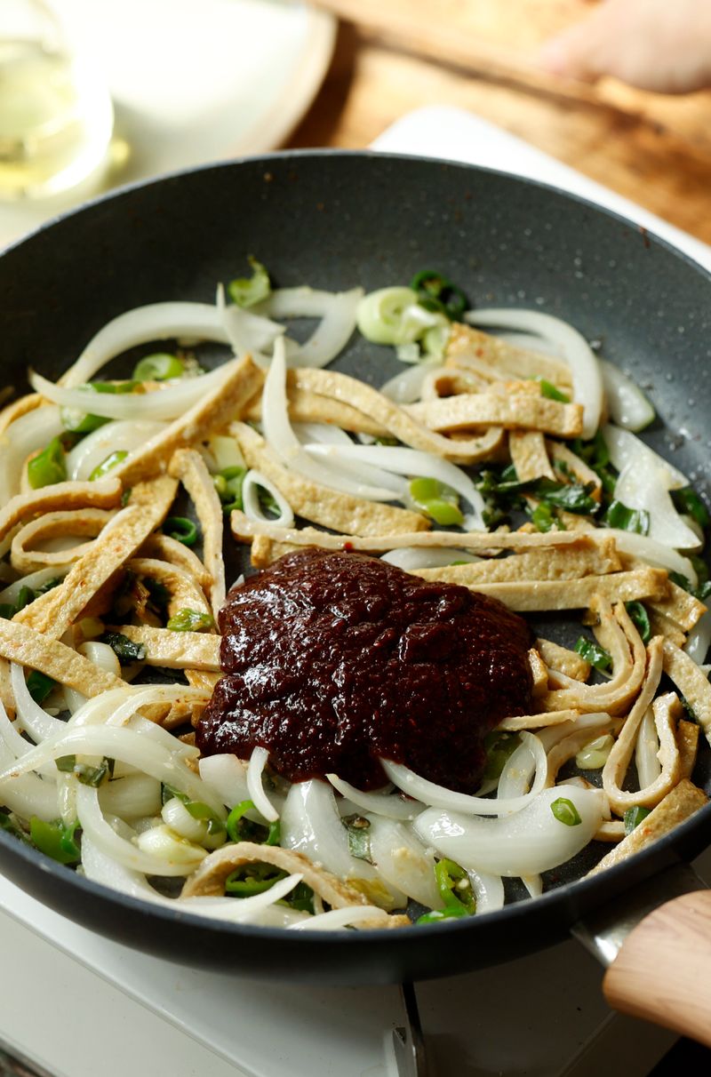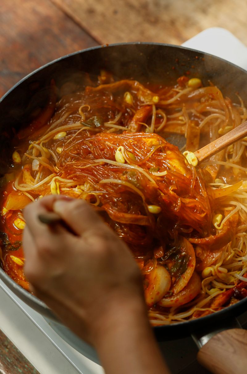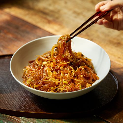 익숙했던 잡채의 색다른 변신! 매콤달콤 빨간 양념을 넣어 휘리릭 볶아내면 빨간 잡채 완성이에요. 칼칼한 양념과 잘 어울리는 콩나물과 어묵을 추가해 다른 반찬 없이도 든든하답니다.