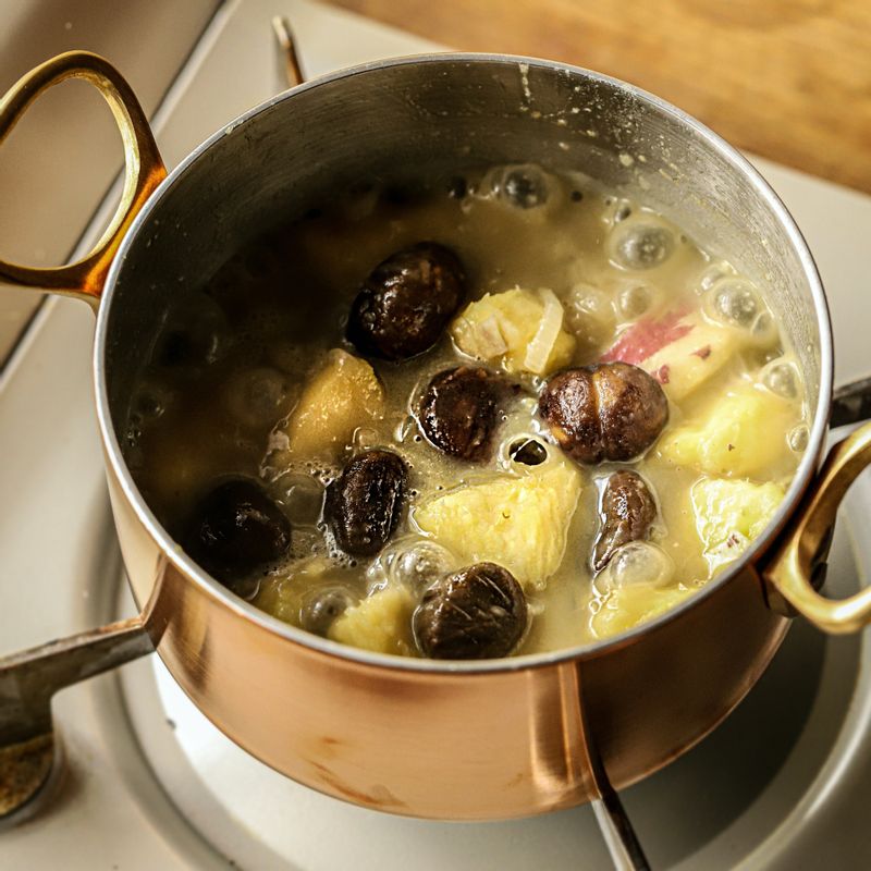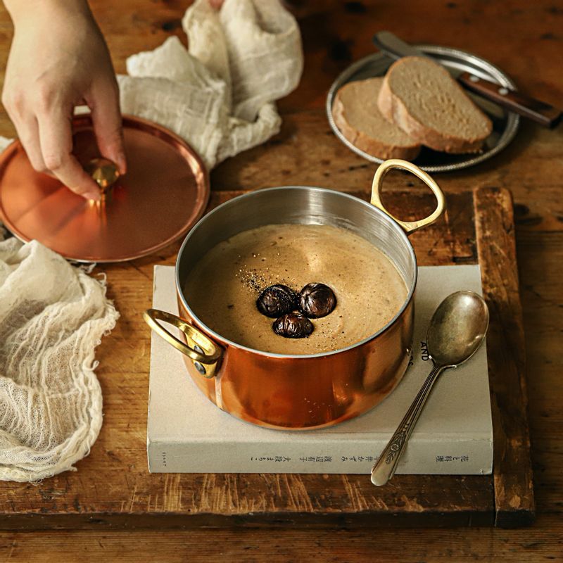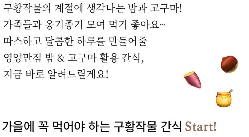 - 쌀쌀한 가을과 잘 어울리는 밤 수프! 고소한 밤과 부드러운 생크림이 만나 조화로운 맛을 내는 밤 수프는 언제 먹어도 맛있는 간식이에요. 여기에 달콤한 고구마도 함께 갈아 넣어 한층 더 깊은 풍미를 맛보실 수 있답니다!