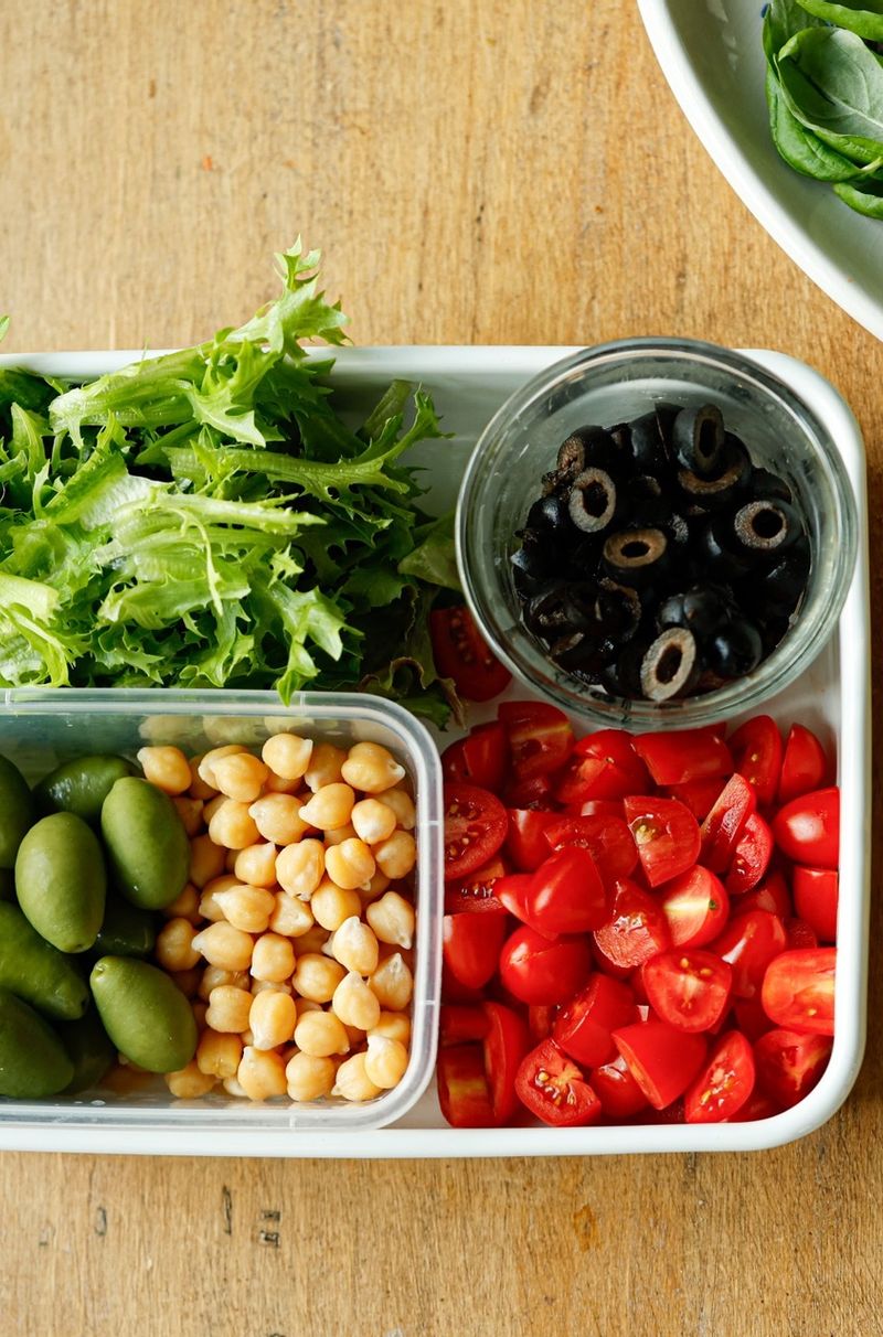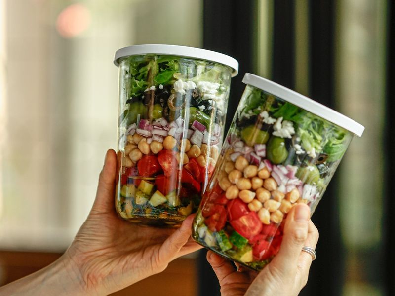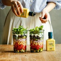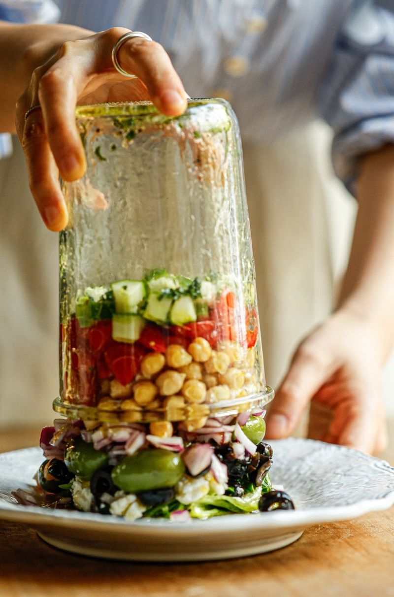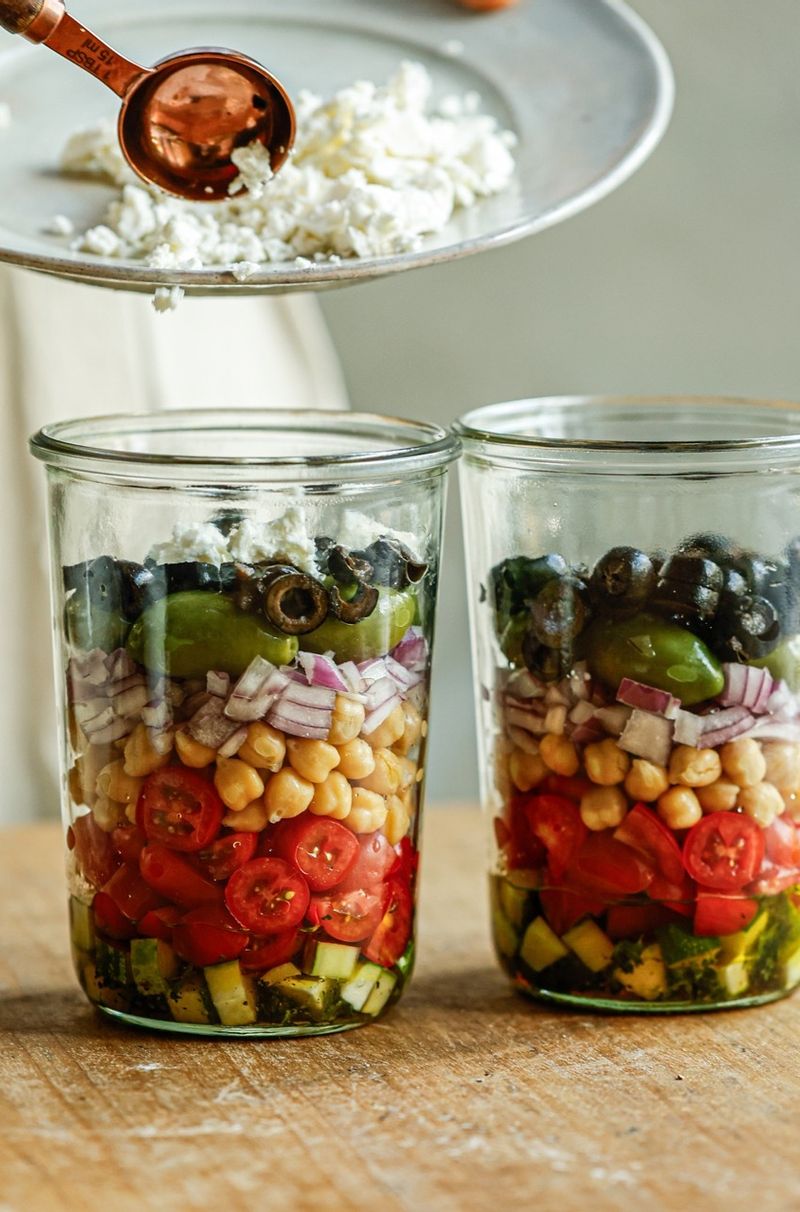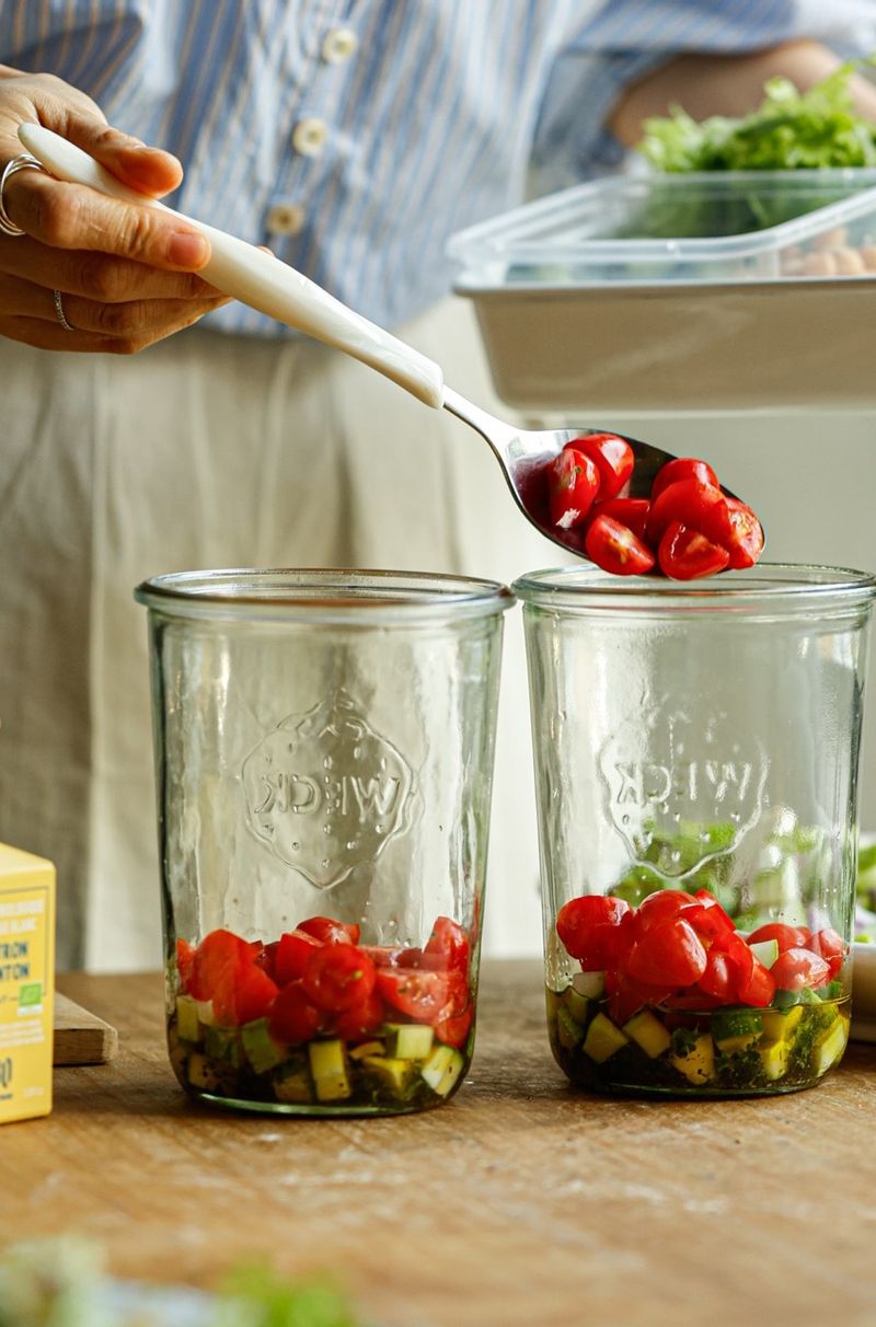 유리병에 각종 채소를 층층이 담아 보기 좋게 완성한 보틀 샐러드! 포만감을 채워주는 병아리콩도 듬뿍 담아 도시락으로도 좋고, 저녁에 미리 만들어 두었다가 다음날 아침으로 먹기도 좋아요.