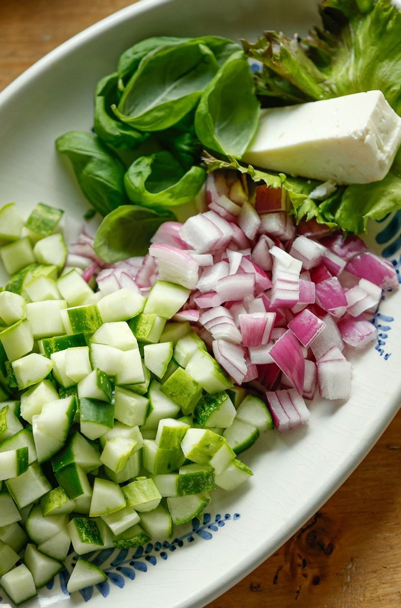 풍미도 좋고 건강에도 좋은 화이트 발사믹 식초 드레싱과 곁들이면 채소의 본연의 맛을 신선하게 즐길 수 있어요. 물론 취향에 따라 등 다른 드레싱을 넣어도 맛있답니다! 📝TIP 1. 채소는 냉장고에 있는 재료로 취향껏 준비해 주시면 돼요. 📝TIP 2. 마지막에 페타 치즈나 모짜렐라 치즈를 얹어 함께 즐겨도 좋아요. 📝TIP 3. 오이는 씨를 제거한 후 썰어야 차곡차곡 담아도 물이 생기지 않아요.