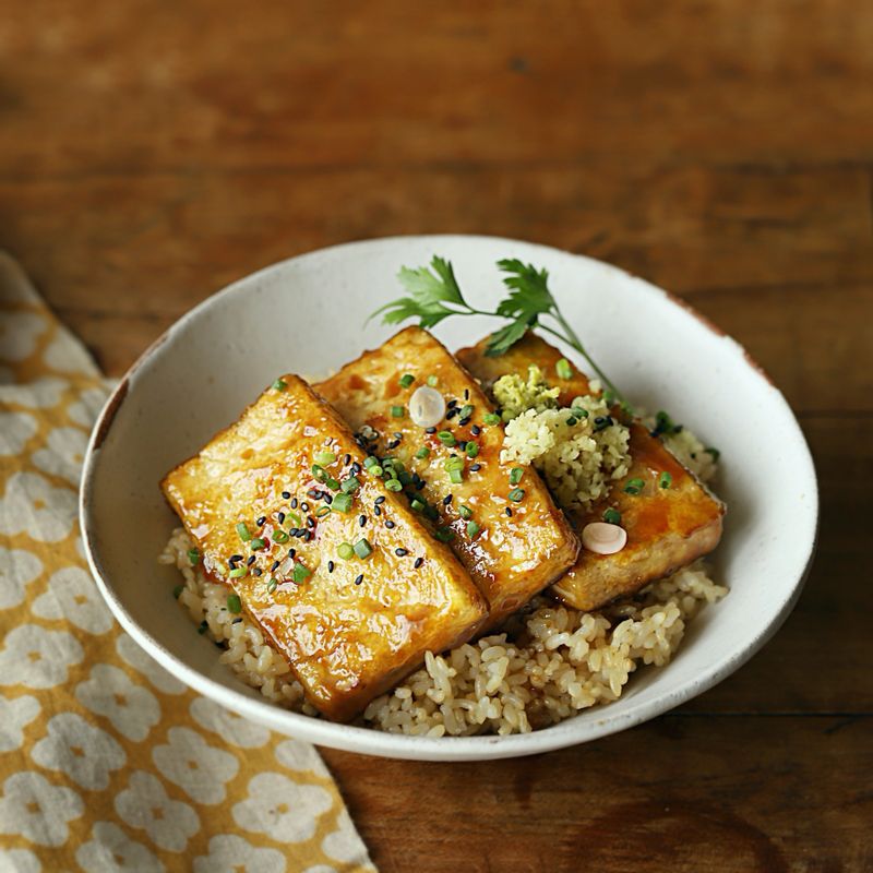 두부로 만드는 건강 밥상의 정석, 두부덮밥! 먹음직스럽게 도톰하게 썬 두부를 간장 베이스로 졸여내 밥 위에 차곡차고 얹어 완성했어요. 여기서 중요한 맛 포인트! 고추냉이와 다진 생강을 곁들여 멈출 수 없는 감칠맛을 추가했답니다.