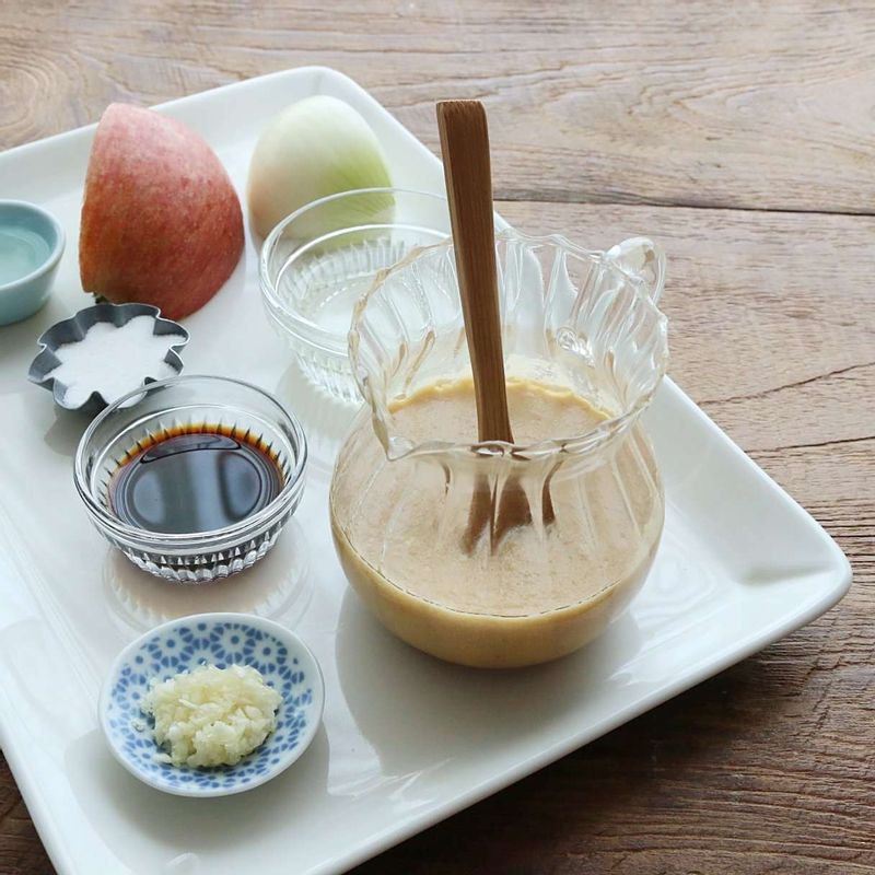 <재료> 양파 - 1/4개 사과 - 1/4개 카놀라유 - 2큰술 간장 - 2큰술 설탕 - 2큰술 식초 - 1큰술 다진 마늘 - 1/2작은술 <만들기> 드레싱 재료를 믹서에 갈아 골고루 섞어주세요. (냉장 보관) * 활용요리 : 돈가스 샐러드