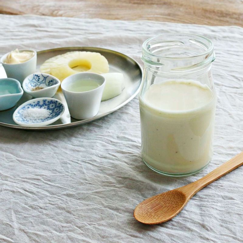 <재료> 파인애플 통조림 - 2쪽 파인애플 통조림 물 - 1큰술 양파 - 1/8개 마요네즈 - 3큰술 식초 - 1/2큰술 소금. 후추 - 약간씩 <만들기> 드레싱 재료를 믹서에 넣고 갈아주세요. * 활용요리 : 목살스테이크