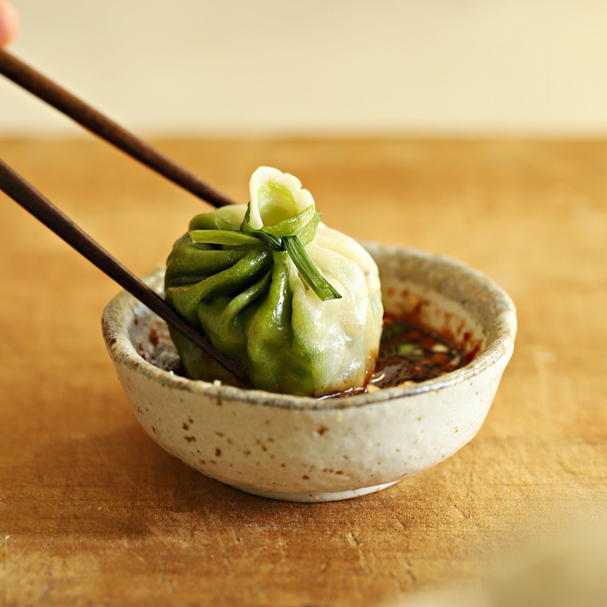 만두피에 만두소를 넣고 복주머니 모양으로 오므려 윗부분에 주름을 잡은 후 데친 부추로 묶어주세요. 김이 오른 찜통에 8~10분 정도 쪄주세요. 볼에 양념장 재료를 넣어 섞어주세요.