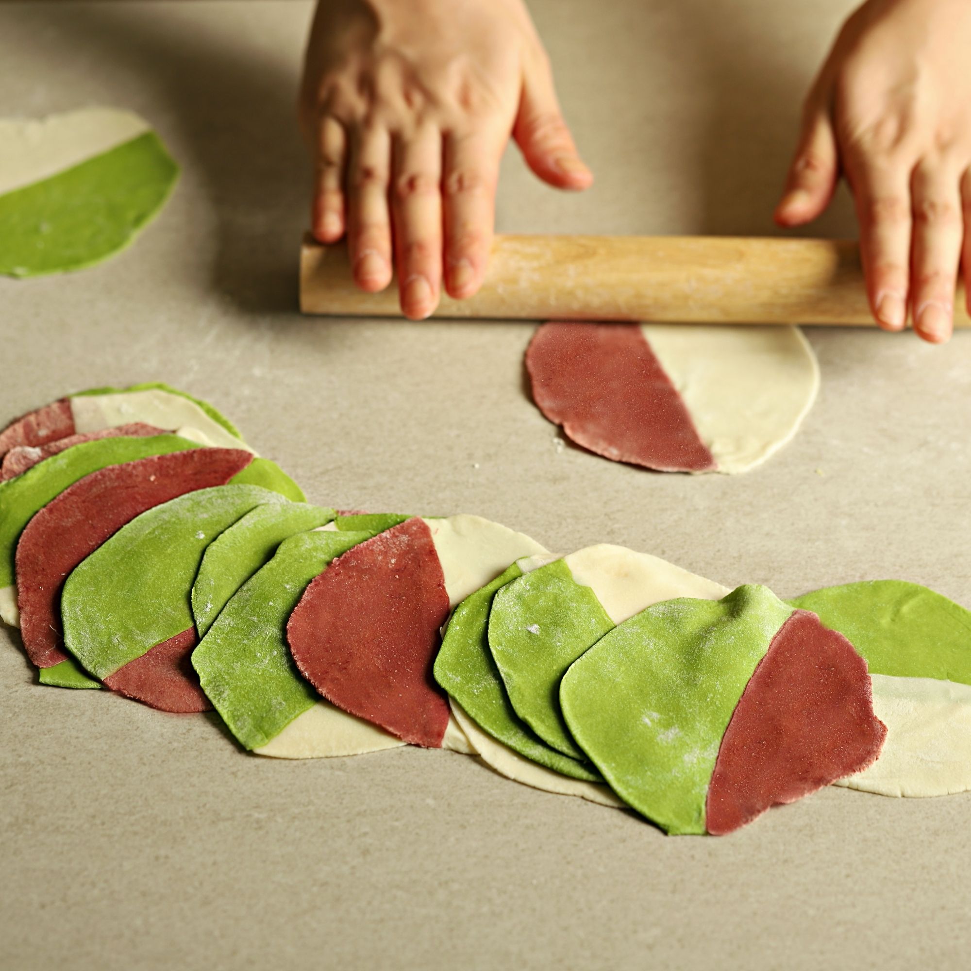 만두피를 반으로 잘라 다른 색의 반죽과 겹친 후 밀대로 밀어 붙여주세요. (만두피는 0.5cm 이상으로 겹쳐야 만두가 터지지 않아요.)
