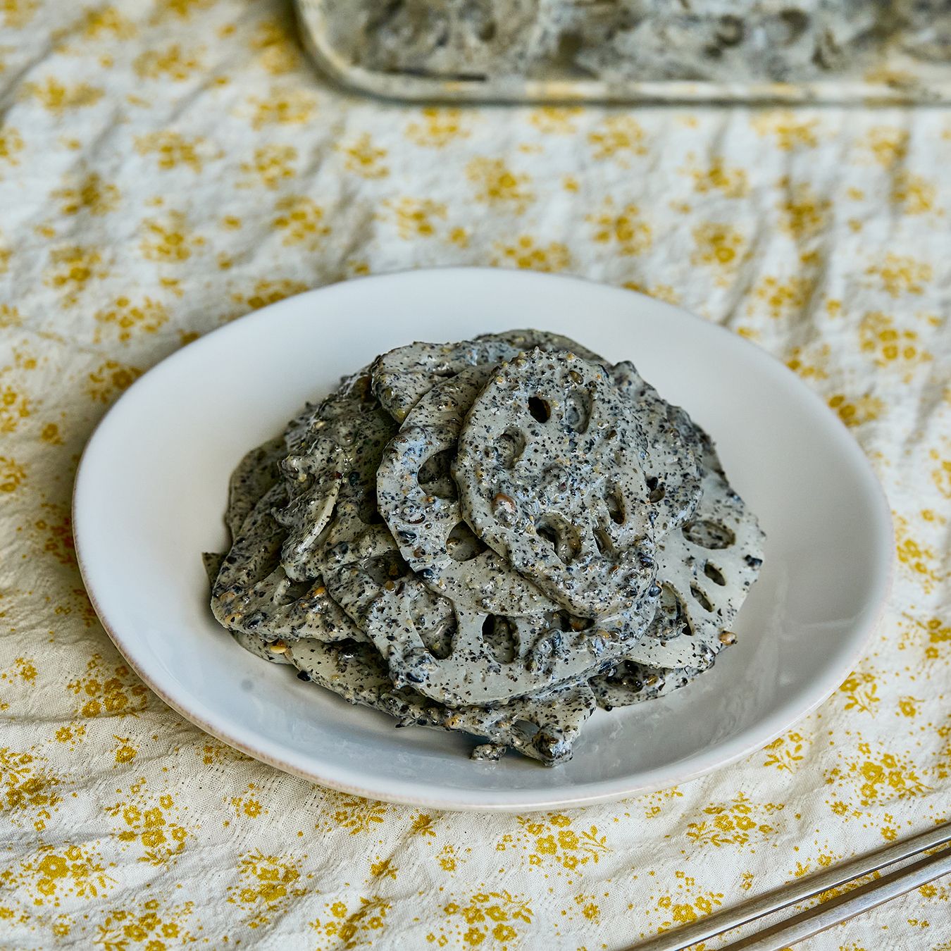 아삭한 연근에 고소한 흑임자 소스를 더한, 담백하고 부드러운 반찬.