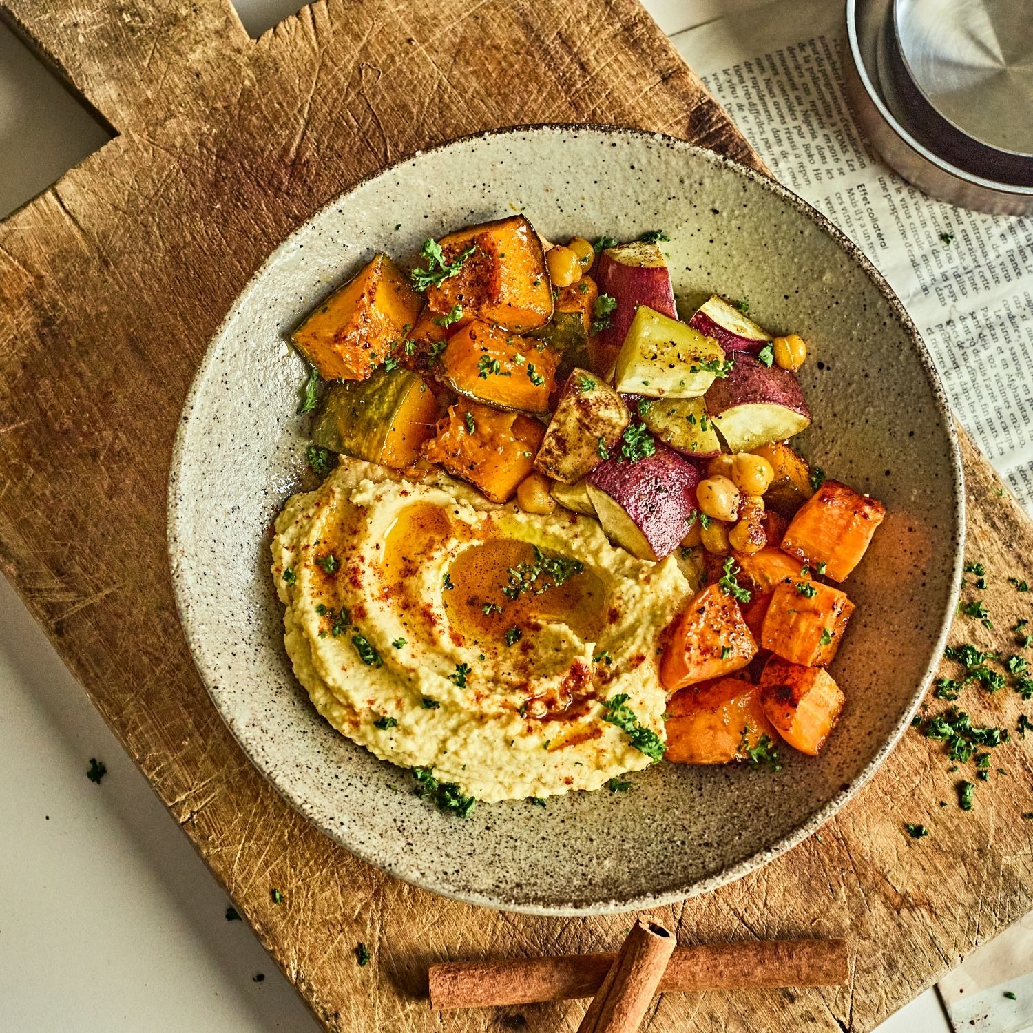 가을 제철 채소와 부드러운 후무스를 곁들인 건강하고 든든한 웜 볼 한 그릇