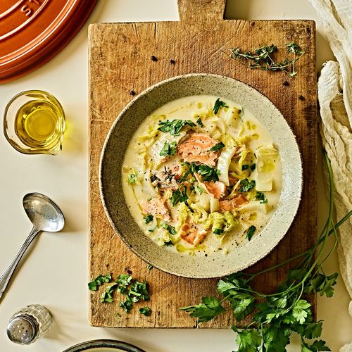 부드러운 배추와 훈제연어의 조합, 고소하고 깊은 맛의 따뜻한 수프 한 그릇.