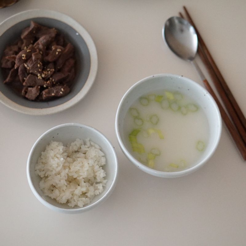 따뜻한 국물이 생각나는 날! 뜨뜻한 사골국에 각종 반찬을 꺼내먹는 가족밥상이에요! 정말 현실 밥상이지요:) #사골국 #곰탕 #소고기장조림 #김치 #가족밥상