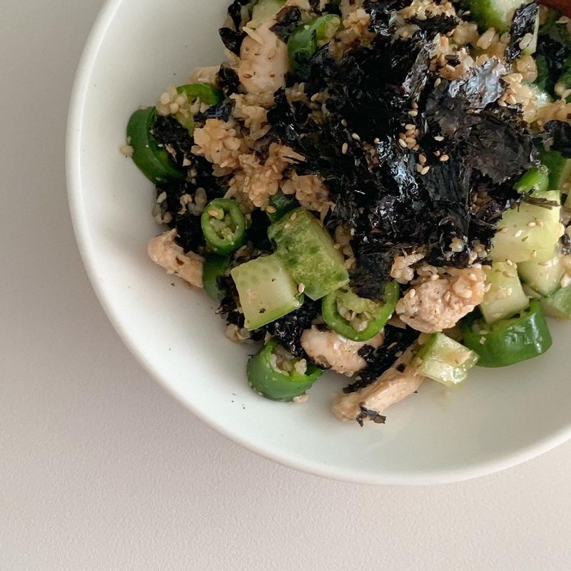 오이고추비빔밥🥣 상콤한 소스에 마무리 들기름 넉넉히 두르면 꼬소하고 난리나는 맛! 벌써 몇번째 해먹었나 몰라요😋 #오이고추비빔밥 #닭가슴살비빔밥 #비빔밥 #생들기름