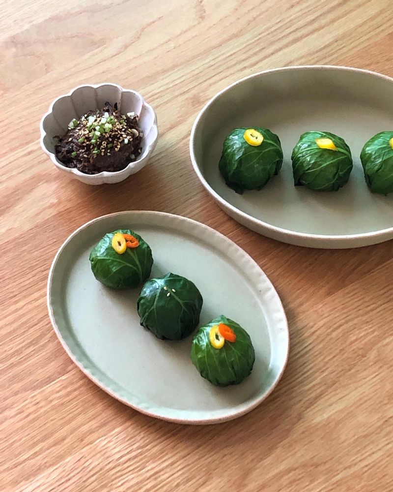고슬고슬하게 지은 잡곡밥을 데친 케일에 돌돌 말아 구수하고 짭쪼름한 멸치 쌈장과 곁들여 먹으면, 밥과 된장의 조화 말해뭐해 너무 맛있는 초간단 한끼 완성 케일 쌈밥 위에 고명으로 청양고추와 깨로 마무리🥬🧡 #케일쌈밥 #멸치쌈장 #존맛탱