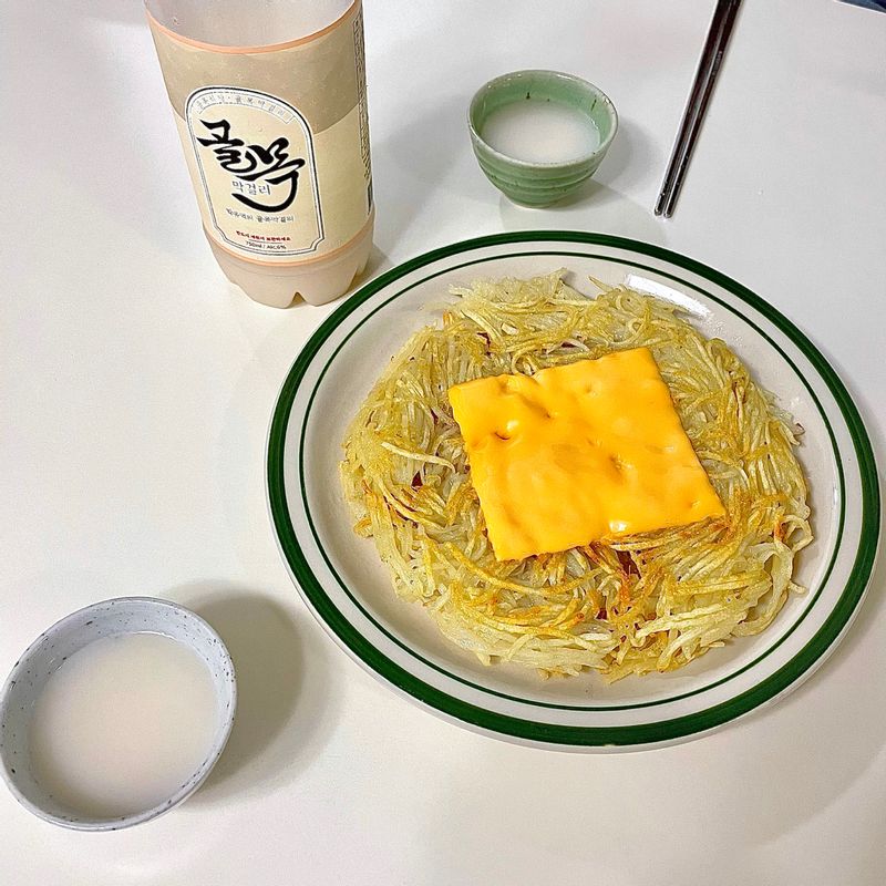 🥔감자채전 비오는 날이면 항상 생각나는 막.걸.리 남편오는 시간에 맞춰 감자채전을 준비했어요! 집에 있는 체다치즈도 한장 올려줬더니 아웃백에서 먹었던 오지치즈! 딱 그 맛이네용😋 두 장을 뚝딱! 이제 나혼자산다보러 가야겠어요~ +골목식당 막걸리로 유명한 골목 막걸리 처음 먹어봤는데 오오오오!!!! 강추합니다👍 #감자채전 #감자전 #감자 #비오는날간식 #간식 #안주 #막걸리 #불금
