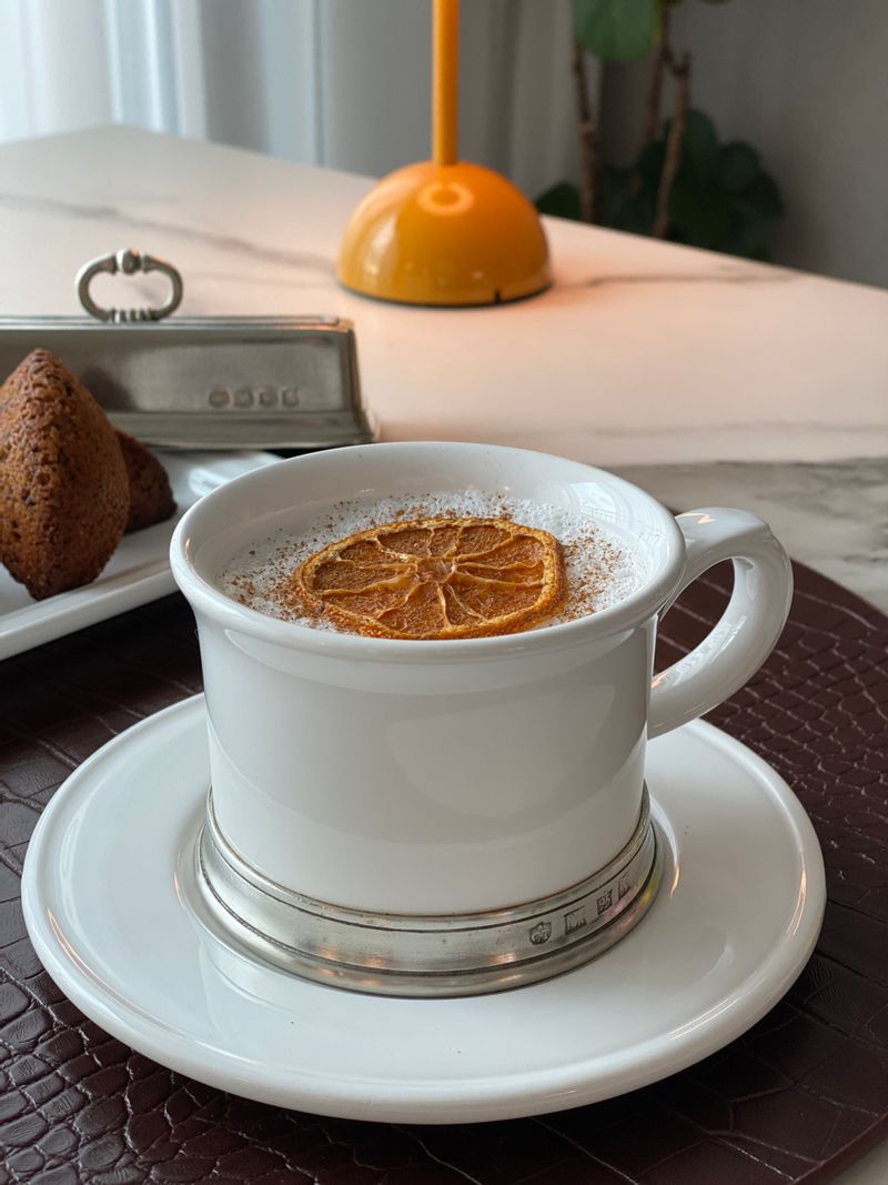 날씨가 추워지니 목도 칼칼 코도 맹맹하네요. 커피말고 따뜻한 진저라떼 만들어서 티타임했답니다. 라떼에 시나몬가루 톡톡 뿌리고 감귤칩 올리니 향도 맛도 더 좋앚네요 #진자라떼 #티타임 #홈카페 #코지타