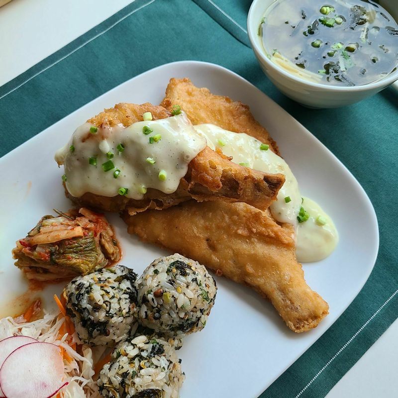집에서 생선을 냄새없이 바삭하게 구워 먹을 수 있어요. 에어프라이어에 돌리면 맛있는 통생선카츠 완성. 오늘은 경양식스타일로 한접시에 간단히 먹었어요. #에어프라이어요리 #생선튀김 #생선구이 #집밥 #생선카츠