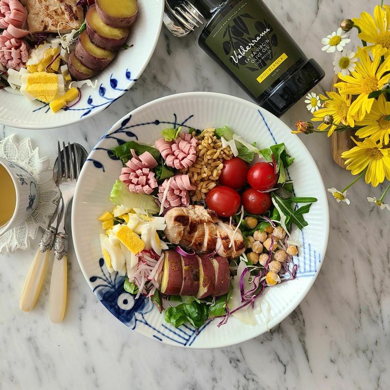 가볍게 시작하는 하루. 샐러드식단에 좋은 올리브유 넣어 건강한 한끼 챙겨요. #홈브런치 #다이어트 #닭가슴살샐러드 #한끼샐러드 #다이어트식단 #샐러드 #건강식
