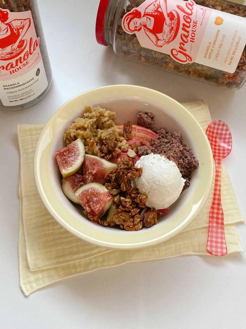 아침으로 즐겨먹는 그릭요거트 그리고 요거트 짝궁은 그래놀라!💓 그래놀라하우스 그래놀라는 청크가 크고 아주 바삭해서 식감이 더 좋아요👏🏻 #그릭요거트 #요거트볼 #그래놀라 #밤앙금 #팥고물 #무화과요거트