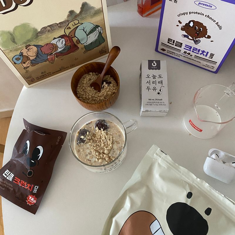 제가 아침 대용으로 자주 먹는 단백질 쉐이크입니당 :) 견과류도 잔뜩 들어있어 우유에 타먹으면 진짜 든든해요💪🏻 #홈카페 #온더테이블 #두잇