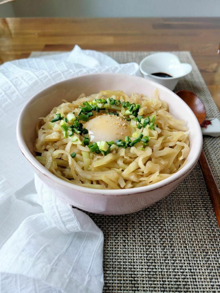 양배추 채썰어 간장양념에 볶아서 밥 위에 수북~ 반숙달걀 깨서 함께 먹으면 고소함과 촉촉함까지 양배추 맛있게 많이 먹을 수 있어 좋아요! #혼밥 #속이편안한 #양배추둥지덮밥 #양배추요리 #건강밥상 #덮밥