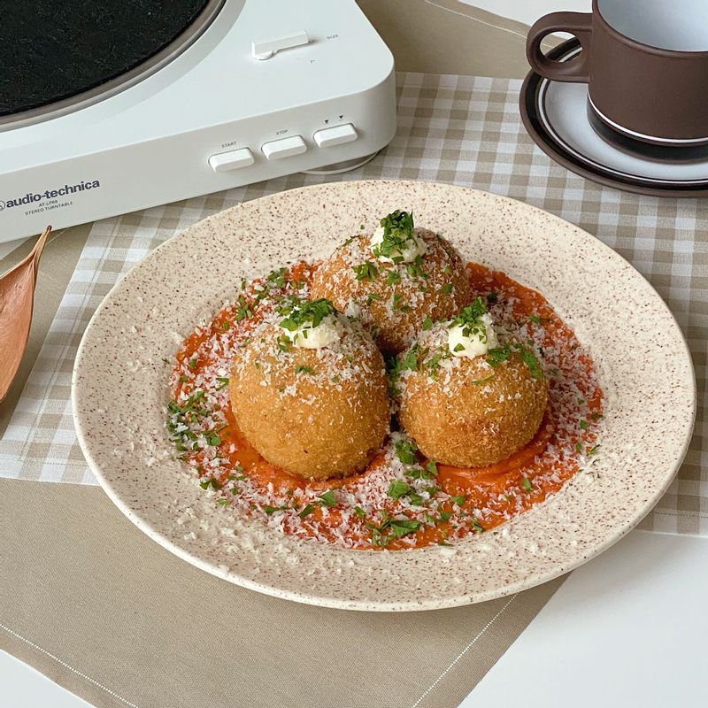 남편이 만들어준 아란치니에요 ^^ 버섯을 넣어 만들어서 고소하고 바삭한데 새콤한 토마토소스와 곁들여 먹으니 너무 맛있었어요 ! #아란치니 #홈스토랑 #홈테이블 #홈브런치