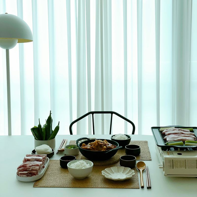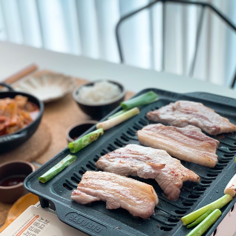 늘 아쉬운마음 가득한 일요일 저녁엔 실용만점 구이바다와 함께 삼겹살 파티로 아쉬운 마음을 위로해봅니다 고기만세 만만세🐷🐷🐷 꿀꿀 #구이바다 #삼겹살 #홈캠핑 #김치찌개 #2인식탁 #2인밥상 #집밥 #신혼밥상