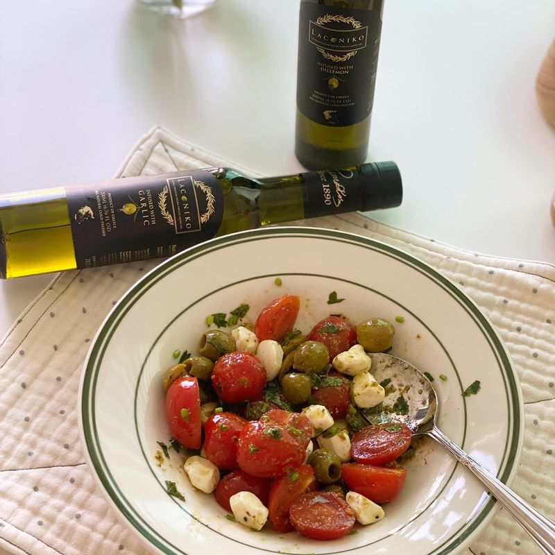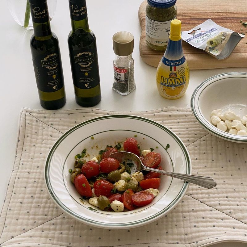 방울토마토 올리브 모짜렐라치즈 넣고 바질페스토 이탈리안파슬리 넣고 올리브유 쪼르르 두르면 간단한데 맛있는 그릭샐러드 완성 이에요 😌🧡 #샐러드 #그릭샐러드 #올리브유 #다이어트 #홈카페 #홈브런치 #간편식