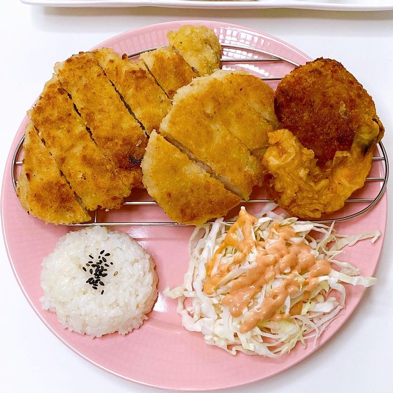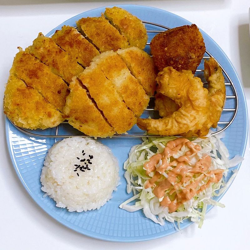 스프빠진 돈까스 정식🥲🤣 돈까스, 새우까스, 새우튀김, 단호박고로케 튀겨주고 양배추샐러드엔 역시 케요네즈😏 후식으로 과일까지 먹으면 하루가 든든하죠(●’◡’●)