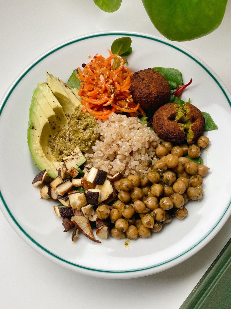 콩을 사랑하는 사람의 점심.jpg 병아리콩+바질페스토 샐러드와 팔라펠까지 더해서 푸짐한 포케느낌으로💚 #병아리콩샐러드 #비건샐러드 #포케 #당근라페