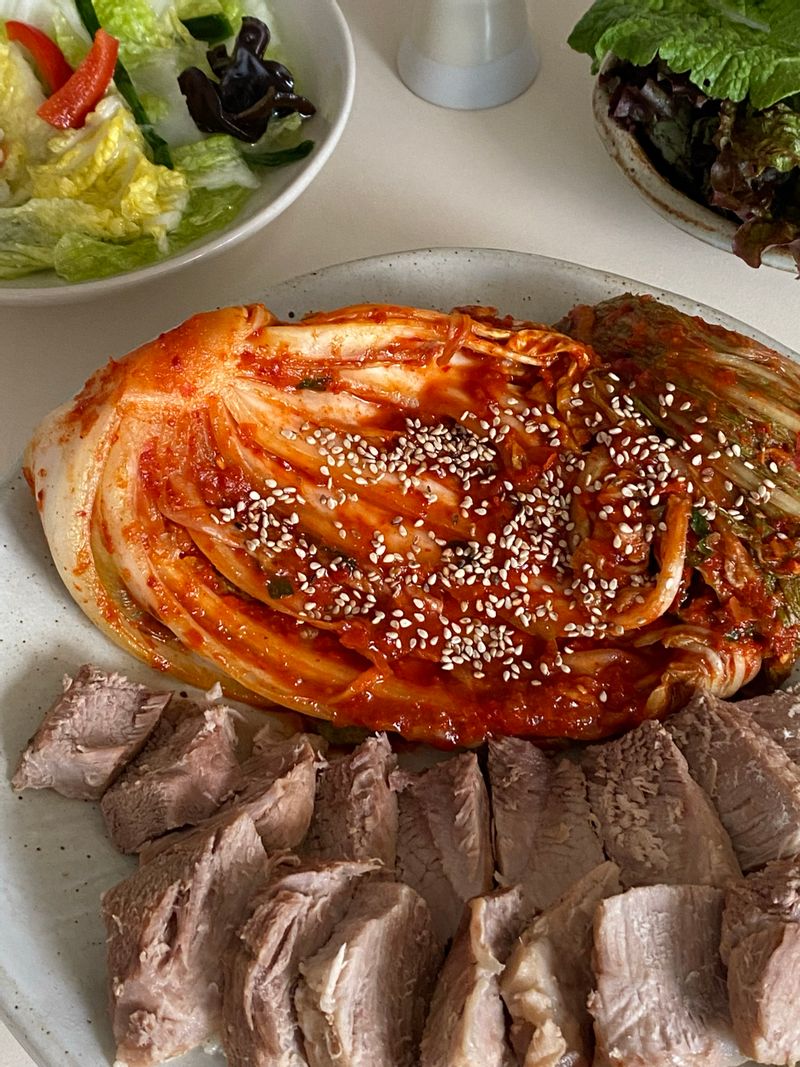 맛있게 삶아진 수육이랑 김장김치 조합은 사랑❤️ 김치, 수육, 굴 넣고 쌈 싸먹으면 꿀맛-! #온더테이블 #수육 #김치 #김장김치 #홈쿡 #굴보쌈 #보쌈 #백김치 #광주요