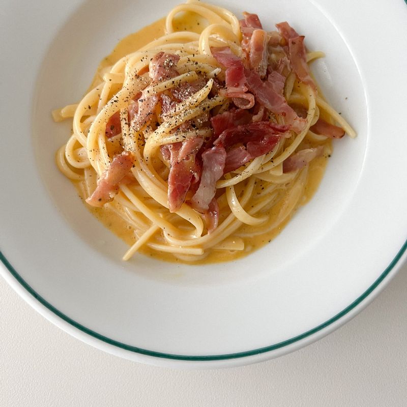 정통 까르보나라🍝 파브리 셰프님 레시피보고 만들었어요! 관찰레(대신 베이컨), 치즈, 노른자, 후추 딱 4가지 재료로 만드는 오리지널 깔보 면수를 초큼 많이 넣어버렸지만 갱장히 치즈치즈한 이 맛〰️🤤 #까르보나라 #파스타 #홈스토랑