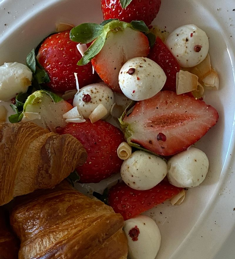 미니 크로와상 생지 굽굽해서🥐 딸기 보코치니 샐러드랑 냠-! 이 샐러드 킥은 코코넛칩🥥 #홈브런치 #온더테이블 #치즈 #딸기 #크로와상 #샐러드 #홈카페