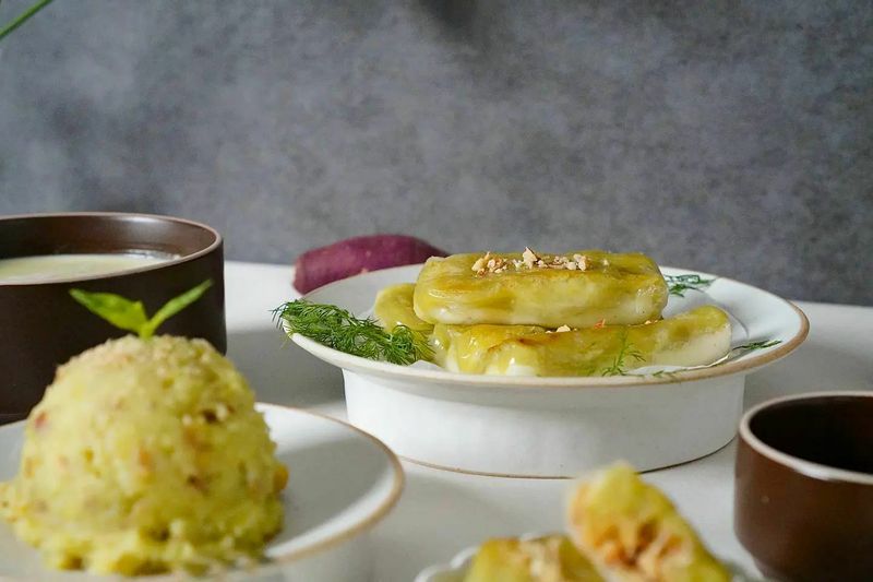 고구마춘권, 라이스페이퍼에 으깬고구마+아몬드가루+슬라이스치즈를 넣고 감싸서 구워줍니다!