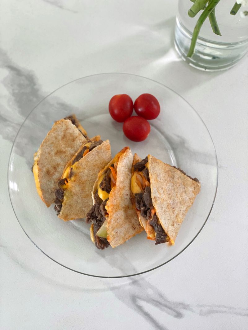 마치 도우 얇은 피자 먹는 느낌! 불고기 가득 넣어 퀘사디아 만들었어요. 브런치, 간식, 안주 등 어디에나 잘 어울리는 것 같아요 :) #불고기 #퀘사디아 #불고기퀘사디아 #치즈 #토마토소스 #피자 #또띠아 #브런치 #홈파티 #안주 #빵 #간식 #접시 #유리접시