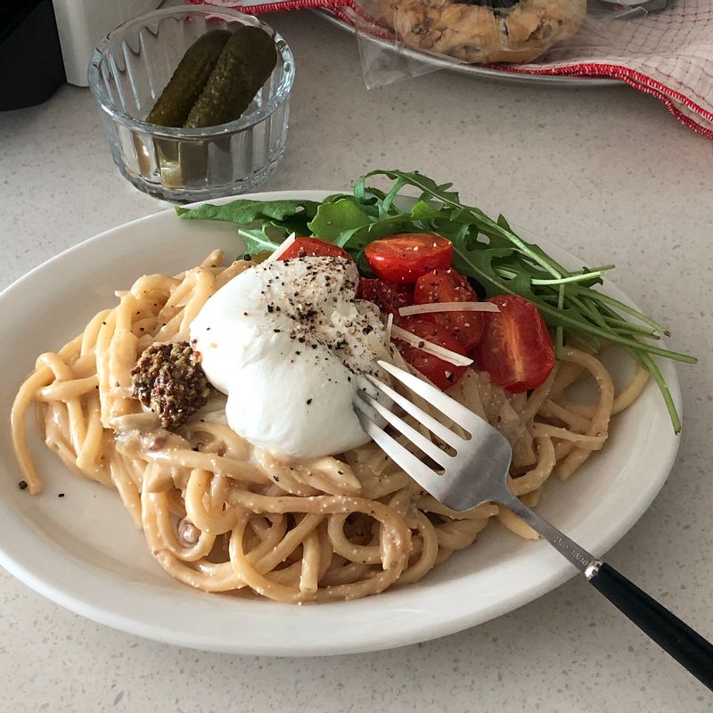 오늘은 좀 무거운 음식이 땡기는 날이네요!! 크림소스 + 명란 듬뿍 넣은 파스타 위에 볶은 토마토와 루꼴라, 부라타치즈 한덩이를 척하니 얹어서 야무지게 냠냠 #홈카페 #집밥 #브런치 #부라타치즈 #크림파스타 #파스타