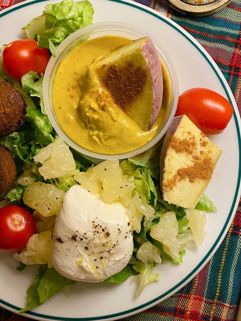 단호박스프를 걸쭉하게 크림처럼 만들어놓고, 차가운 상태로 먹으니 또 별미🎃 단호박에 고구마도 찍어 먹으니 아주 달달하네요?❤️ #단호박크림 #팔라펠 #부라타치즈 #자몽샐러드